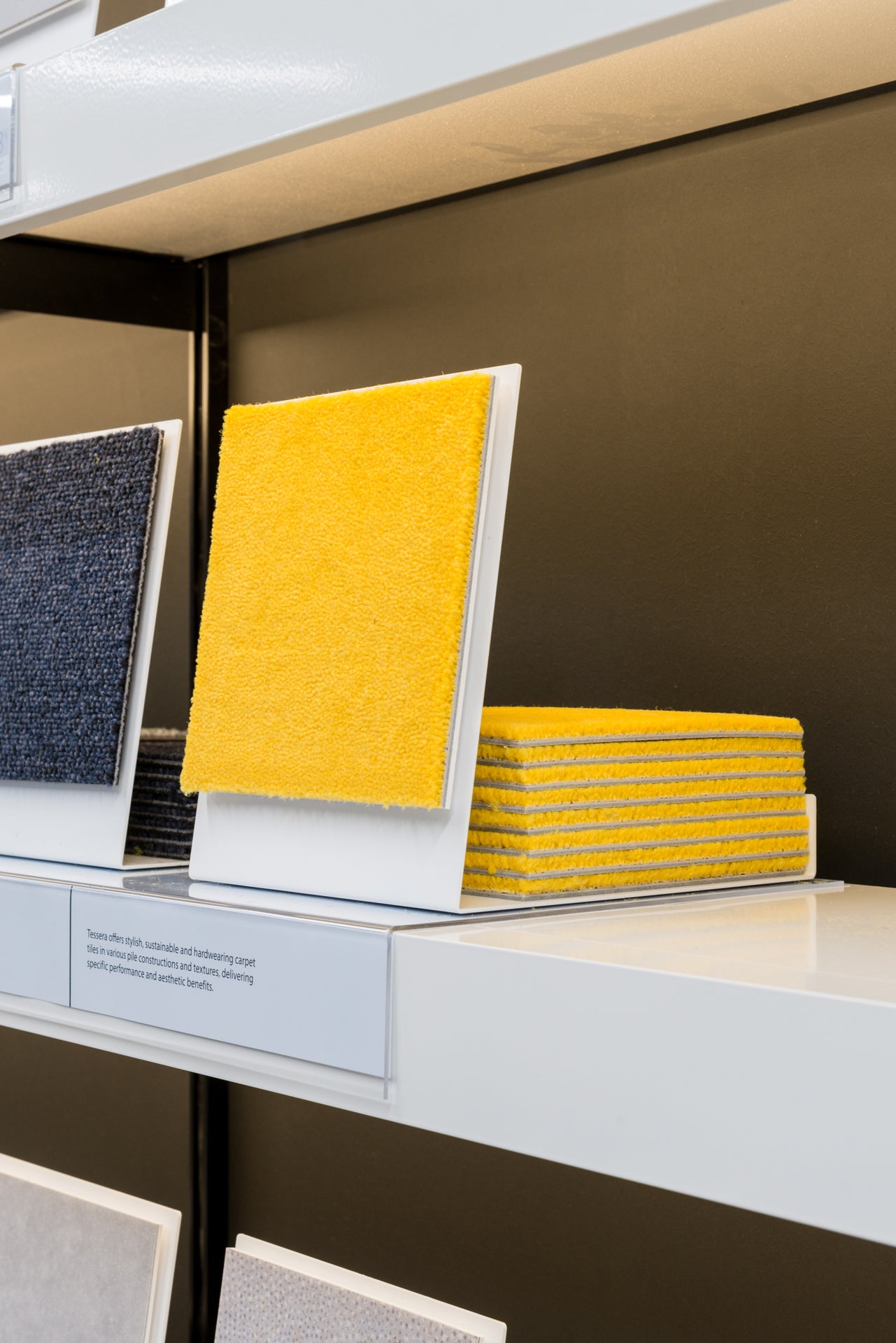 Retail shelving - 5 metre long white shelves with lighting display Forbos flooring products